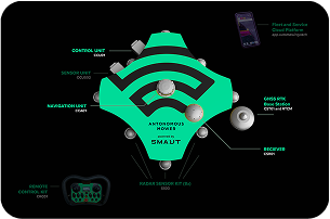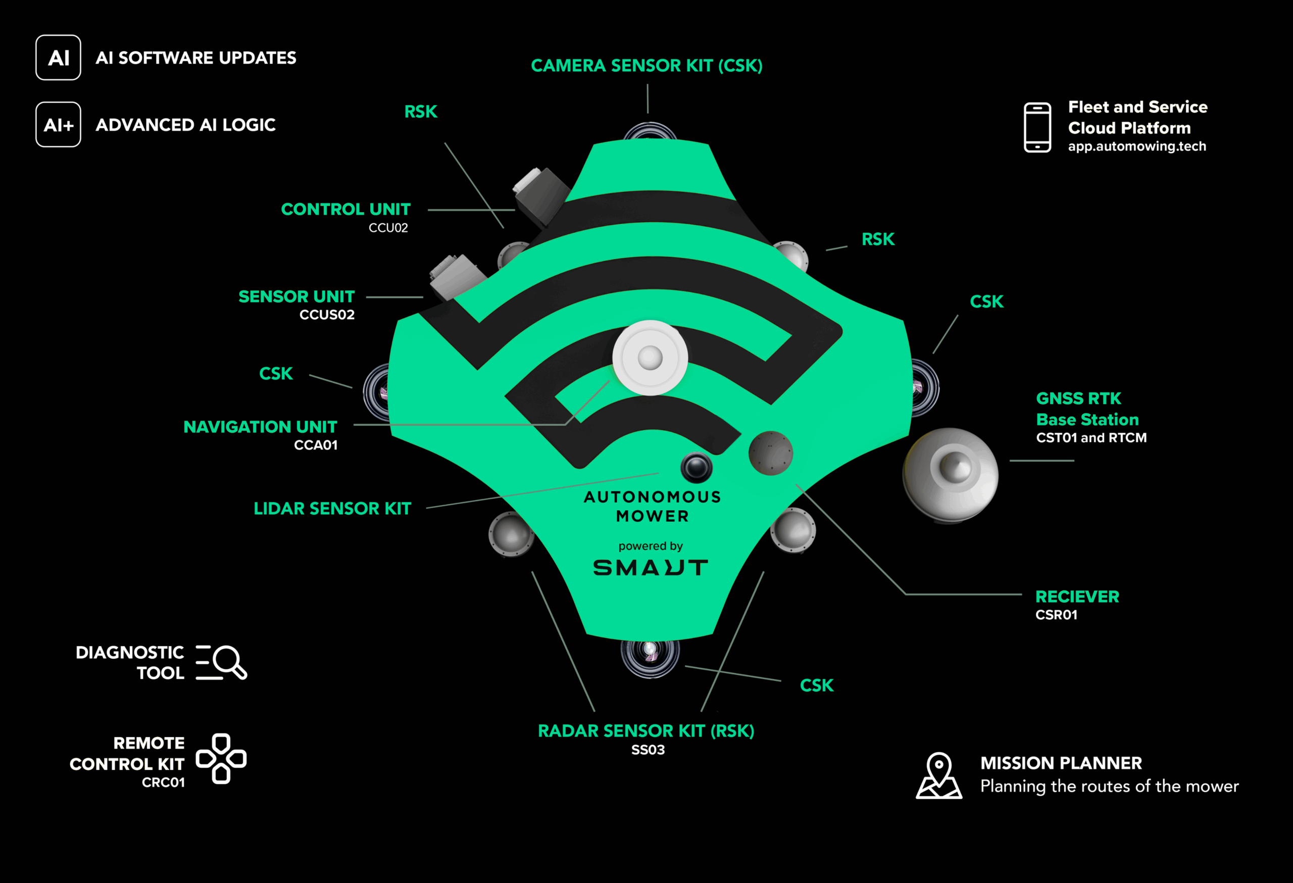 SMAUT delivers autonomy through a modular system of hardware and software components. These products are combined to achieve the desired autonomy level (Level 0–4), specifically tailored to the demands of mowing and green care machinery operating in real-world terrain.