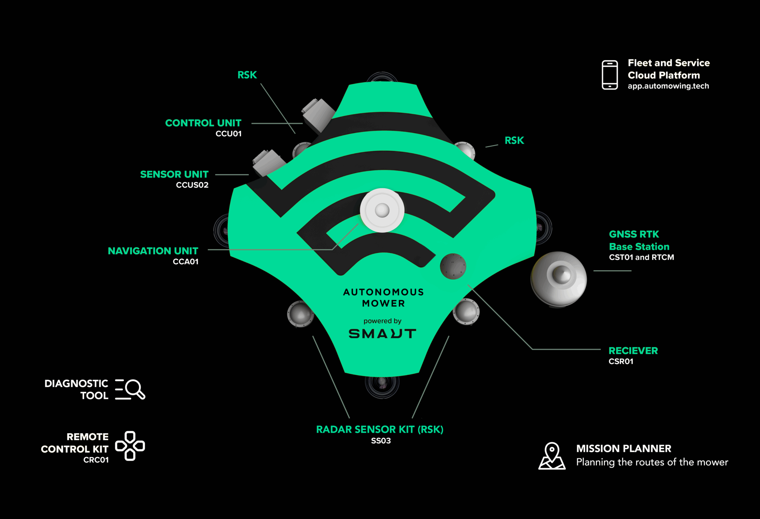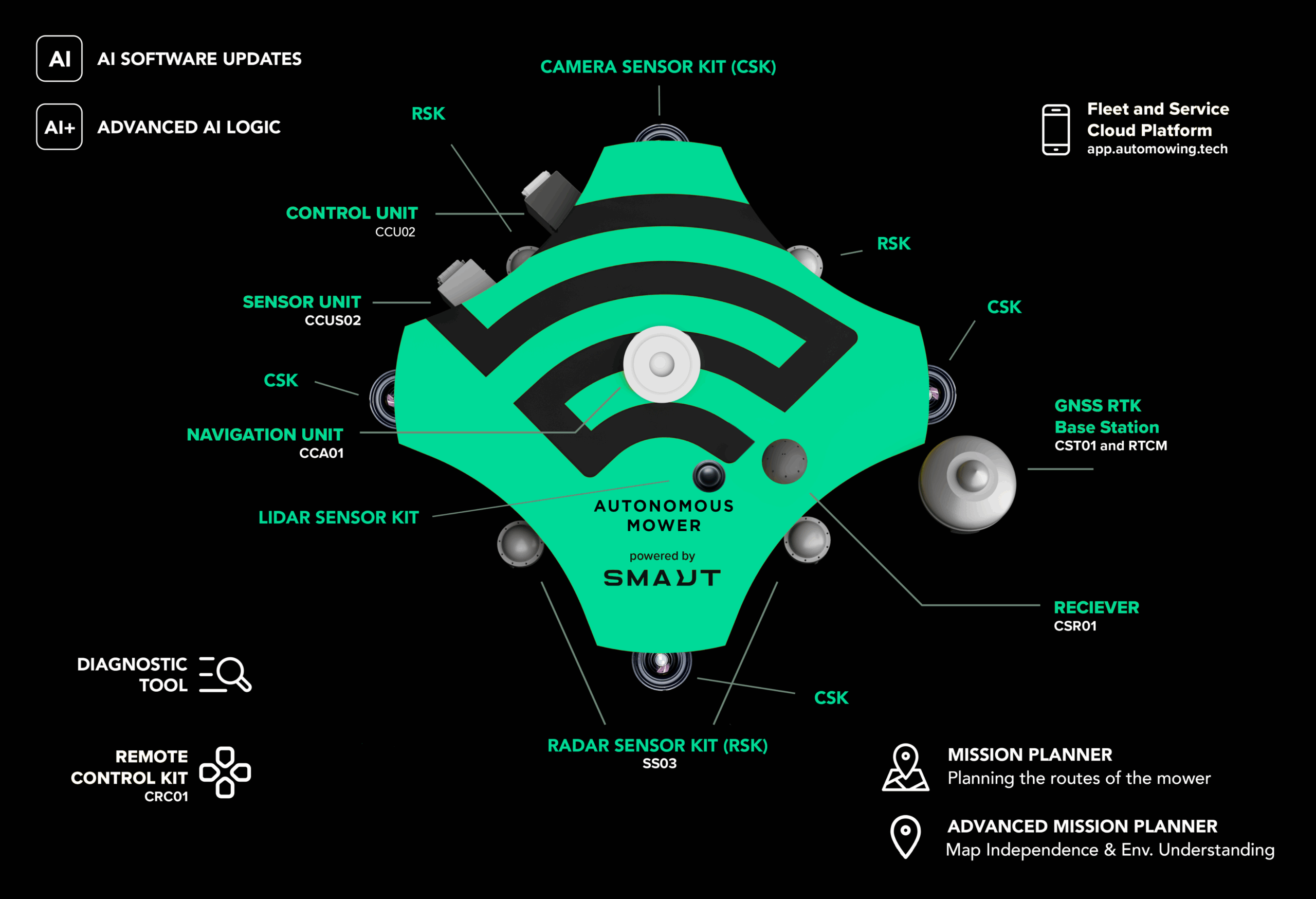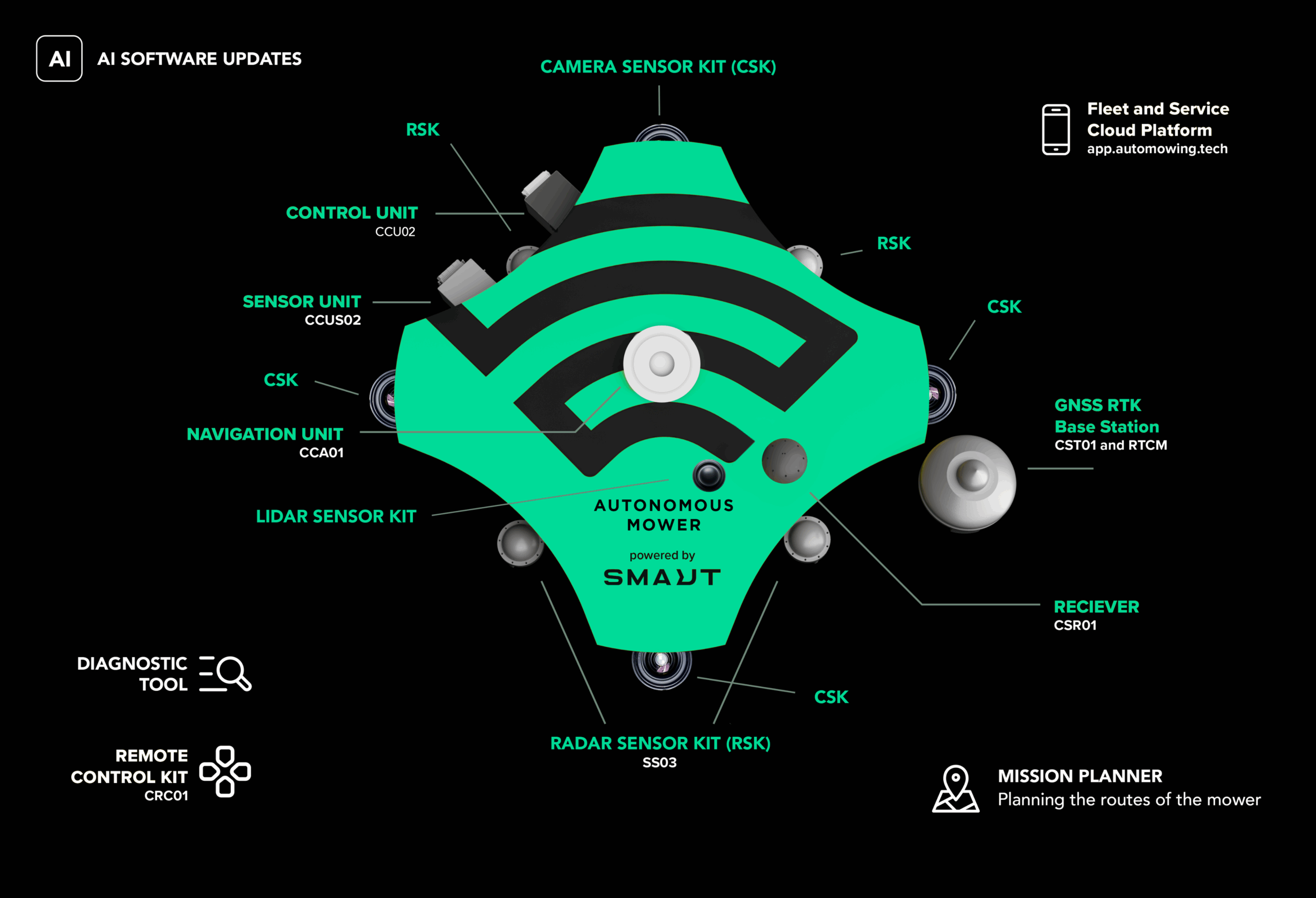 Accessed via portal app.automowing.tech. Enables fleet management, data logging, software updates, and diagnostics. Required for Levels 0–4. Integrates with control unit and sensor suite for remote supervision